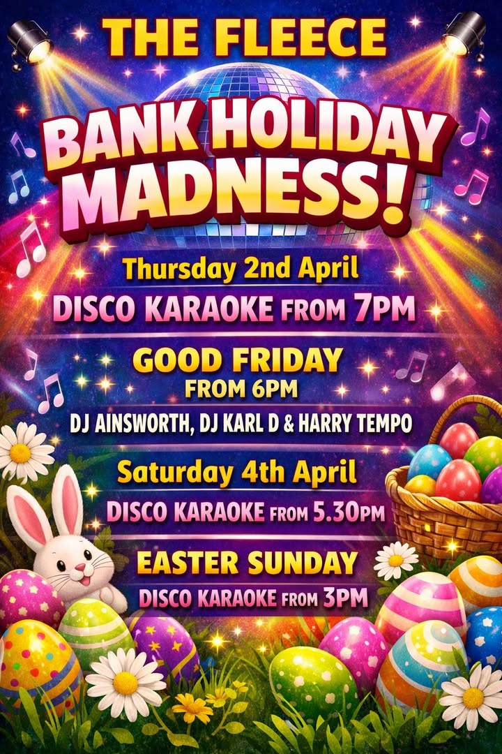 🔥 BANK HOLIDAY = PARTY MODE ON! 🔥 Get ready for NON-STOP vibes at The Fleece this weekend! 🎤🕺 💥 THURSDAY 2ND APRIL Kick it off with Disco Karaoke from 7PM – grab the mic & own the night! 🔥 GOOD FRIDAY FROM 6PM Live DJ sets with Ainsworth, Karl D & Harry Tempo – pure dancefloor energy! 🎉 SATURDAY 4TH APRIL More Disco Karaoke from 5:30PM – round two, louder than ever! 🐣 EASTER SUNDAY FROM 3PM Sing, dance, celebrate – Disco Karaoke all afternoon and a heck of a bank holiday party! ✨ 4 DAYS. BIG TUNES. GREAT VIBES. ZERO EXCUSES. Tag your crew & let’s make it a weekend to remember! 💃🎶 #BankHolidayMadness #TheFleece #PartyWeekend #DiscoKaraoke #EasterVibes